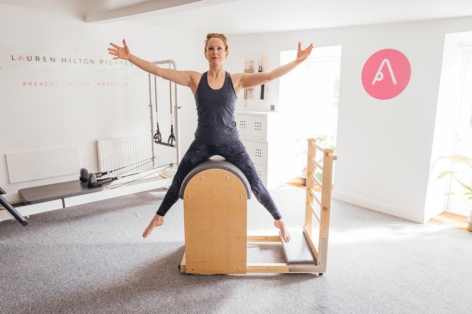 Lauren demonstrates the Pilates move Horseback on the Ladder Barrel
