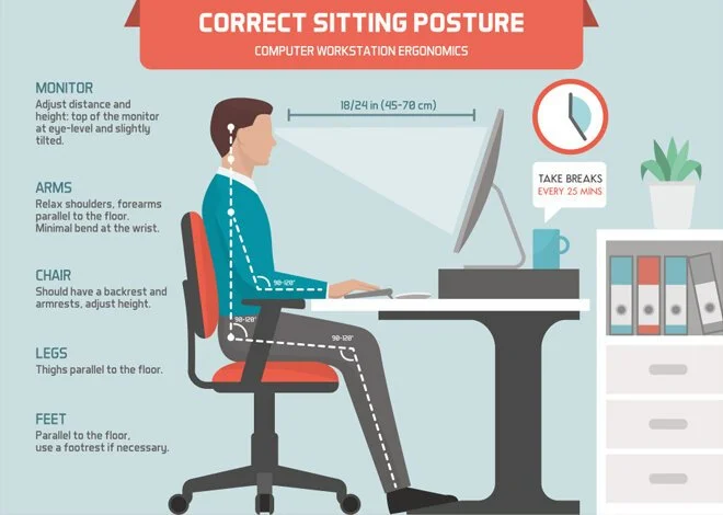 Sit within reach — The ideal way to sit is to distance your torso from the monitor about an arm’s length. The monitor should be 2 to 3 inches above the eye level.